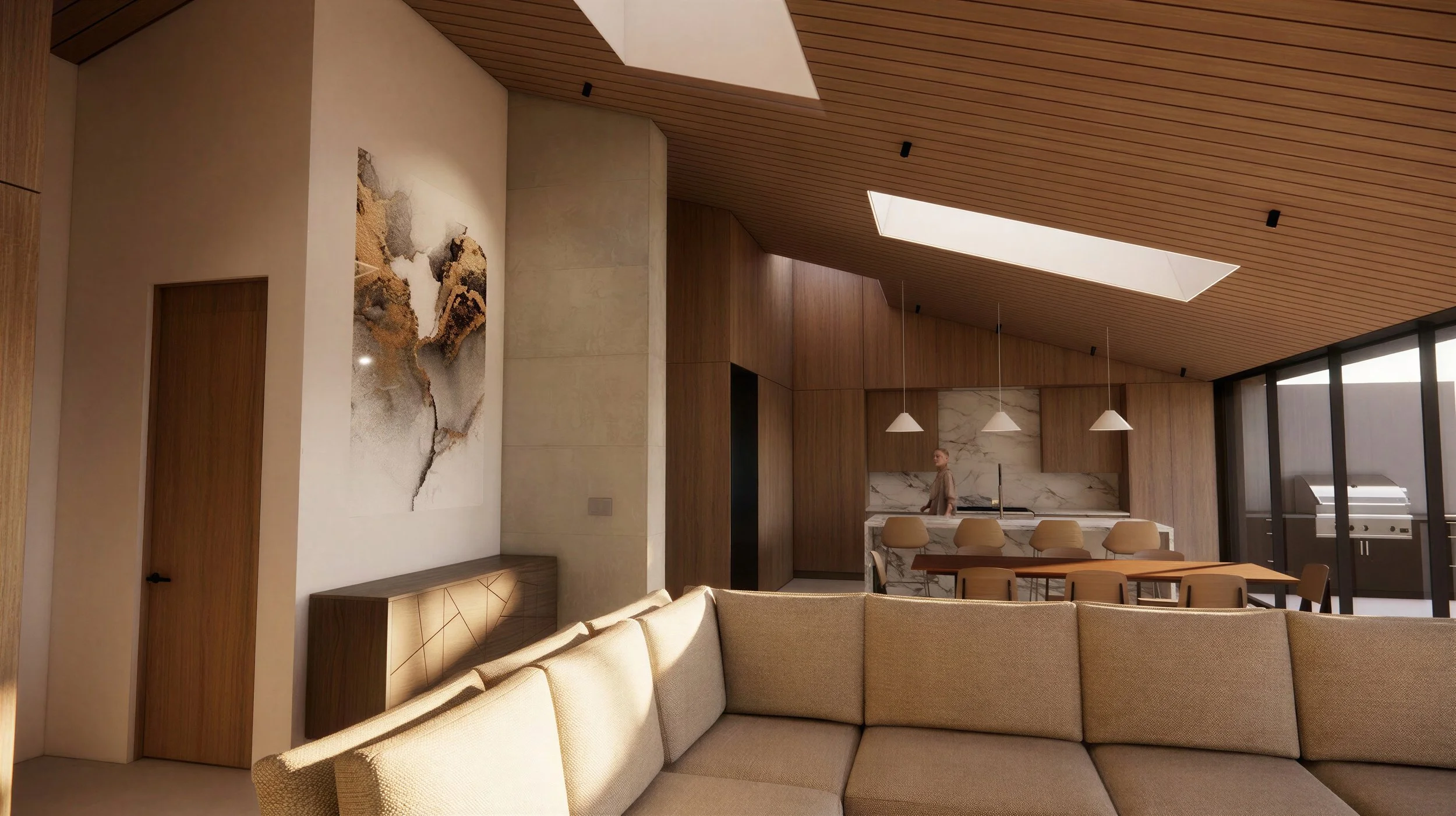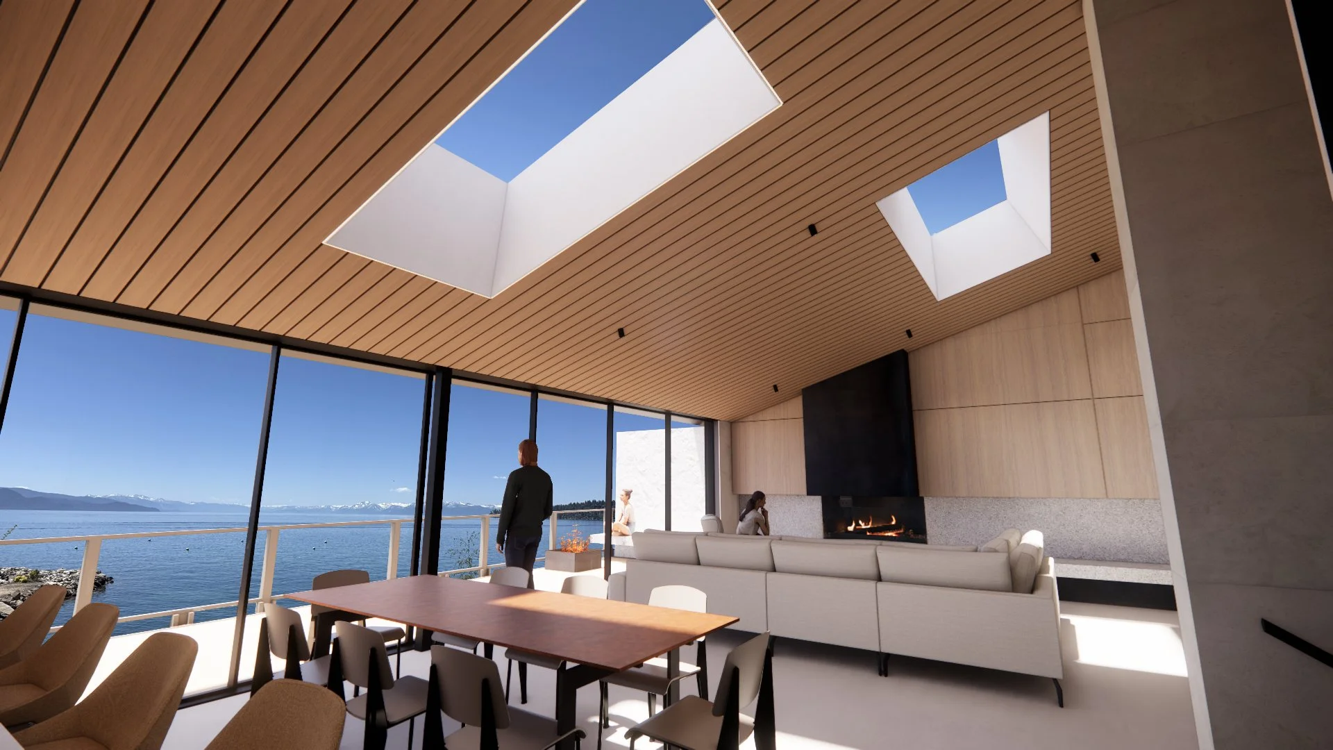 The design is driven by openness, continuity, and an elevated sense of livability, creating spaces that feel both expansive and intimately connected to the waterfront setting. Highlighted by a massive 35 foot Bi-parting sliding glass wall that opens the entire lake elevation to the outdoors. Through the careful integration of the two units, the project establishes a cohesive interior environment that is creative, refined, and highly tailored to modern lakefront living. The result is a dramatic transformation of the original structure into a residence defined by light, luxury, and blurring the boundary between the interior and the lake.